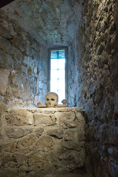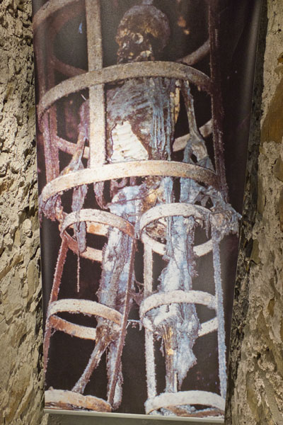 In den Zwischenetagen des Bergfrieds sind Szenen aus dem Mittelalter nachgebildet. So erfährt der Besucher einiges über die grausamen Foltermethoden, wie z. Beispiel, das Strecken oder das Auspeitschen. Im Eisenkäfig ließ man den Verurteilten verdursten und verhungern, andere wurden lebendig eingemauert. Es gab einen Pranger und ich probierte die Schandgeige aus. Es ging wohl hoch her im Mittelalter...