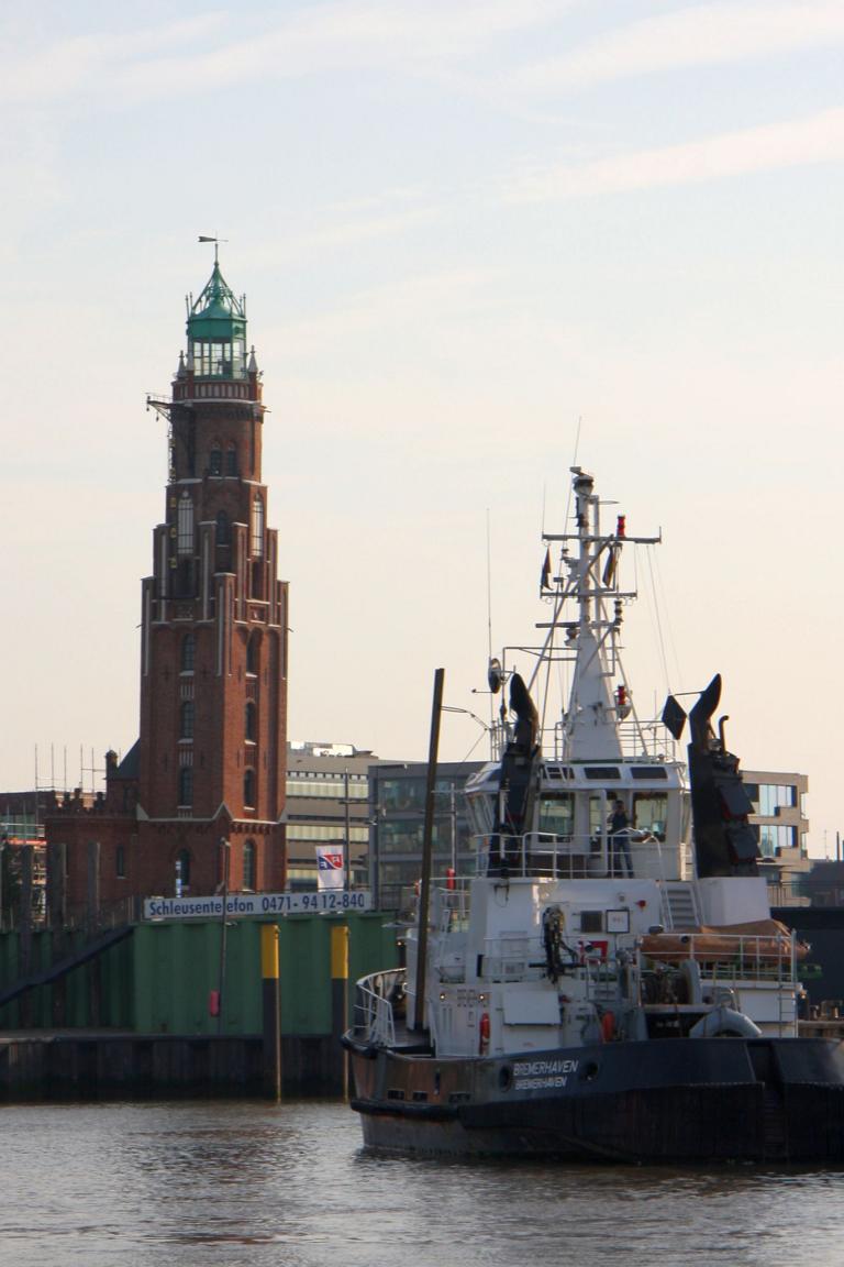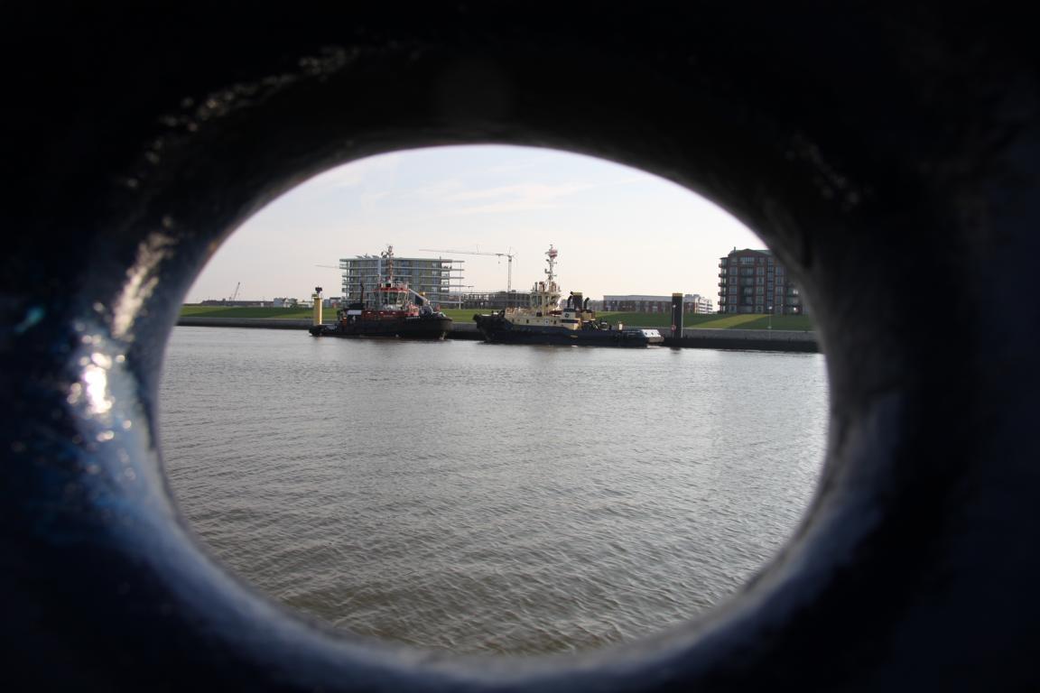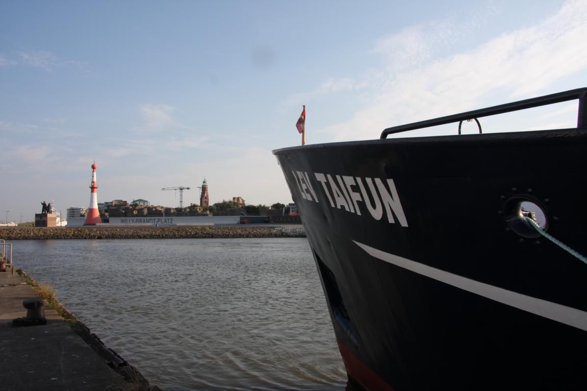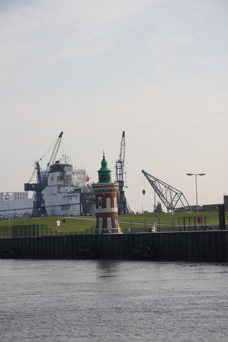 Dann geht es los: Zunächst entlang der Schlepper, am Simon-Lochen-Leuchtturm in Bremerhaven vorbei und am kleinen Pingelleuchtturm vorbei, dem einzigen Leuchtturm übrigens mit einer Nebelglocke