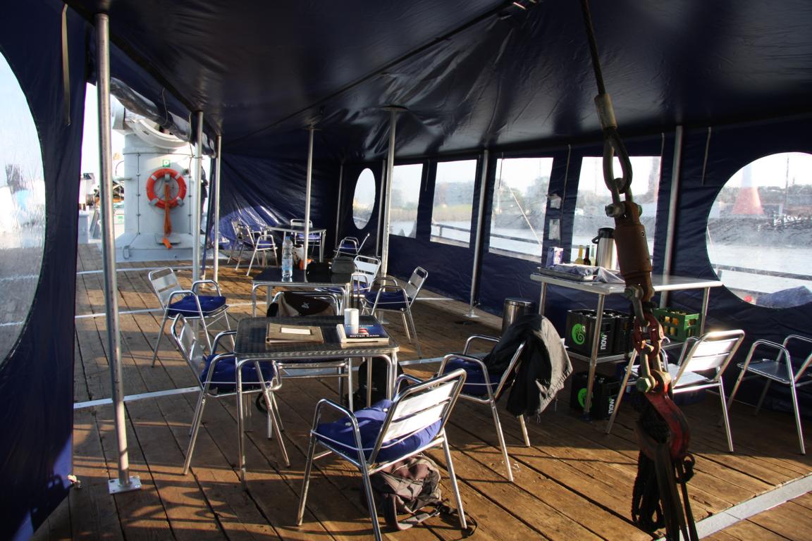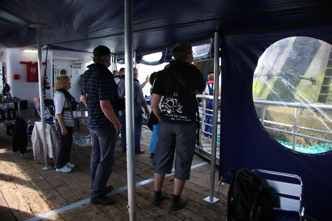 Auf dem Schiff gibt es auf Deck eine Überdachung und beim Ablegevorgang sollen wir uns in diesem Bereich aufhalten, um nicht verletzt zu werden -