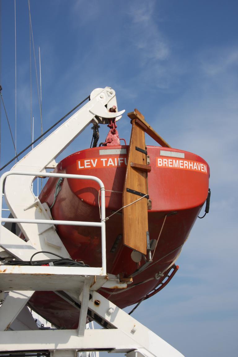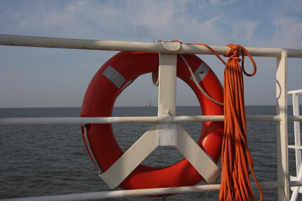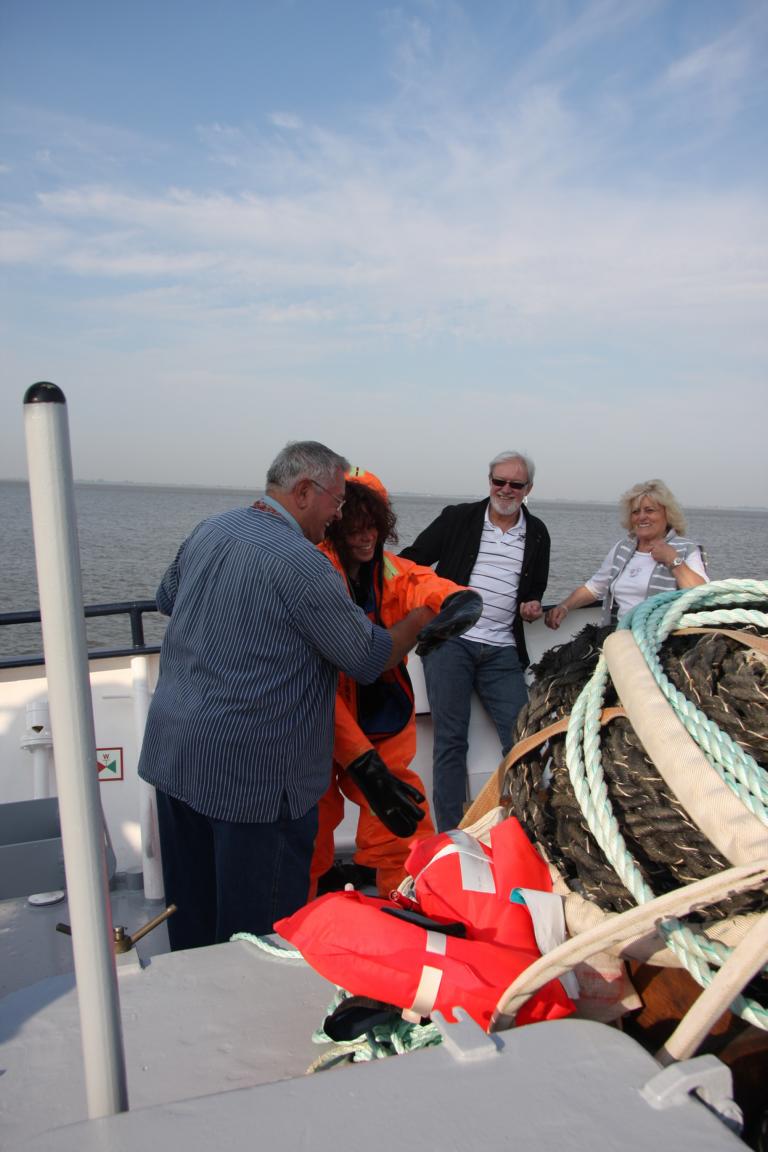 Nachdem wir an den Containern vorbei sind, werden Verhaltenshinweise gegeben. Die Fahrt wird von einem Mitglied der Stiftung zum Erhalt für den Leuchtturm begleitet - ein älterer recht rundlicher freundlicher Herr. Dieser erklärt zunächst, dass 4 Übernachtungsgäste bis morgen auf dem Turm bleiben. Diese müssen einen Turmsprecher bestimmen - es sind drei Männer und eine Frau und keiner hat so richtig Lust auf diesen Job. Da bestimmt unser Begleiter schlichtweg die Frau zum Turmsprecher. Und sie ist dann auch gleich Objekt zur Veranschaulichung wie man die Ohnmachts-sichere-Rettungsweste anlegt und wie man den Überlebensanzug anzieht. Sie ist klein und eher zierlich und der Anzug ist von klein bis riesig gemacht, so dass es doch recht lustig aussieht, wie sie darin versinkt.