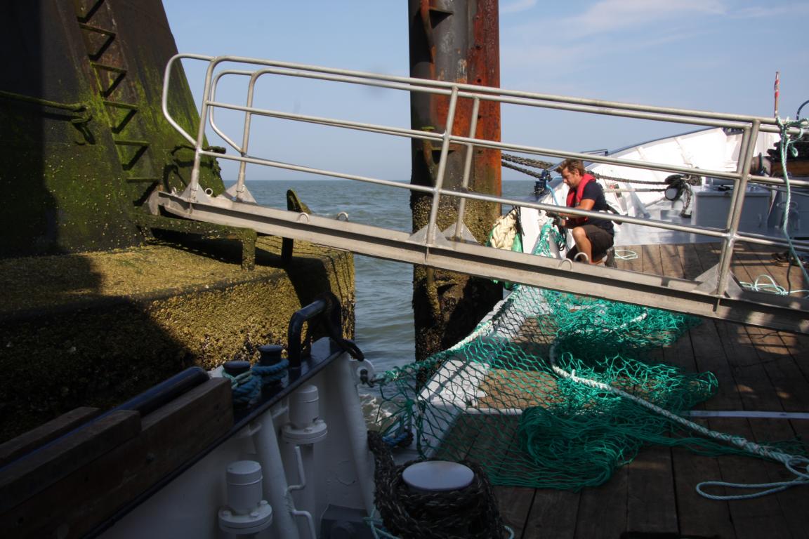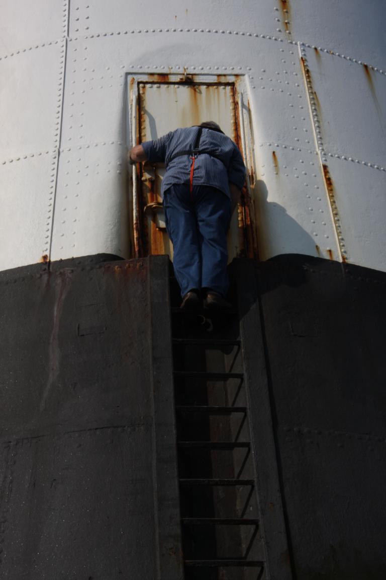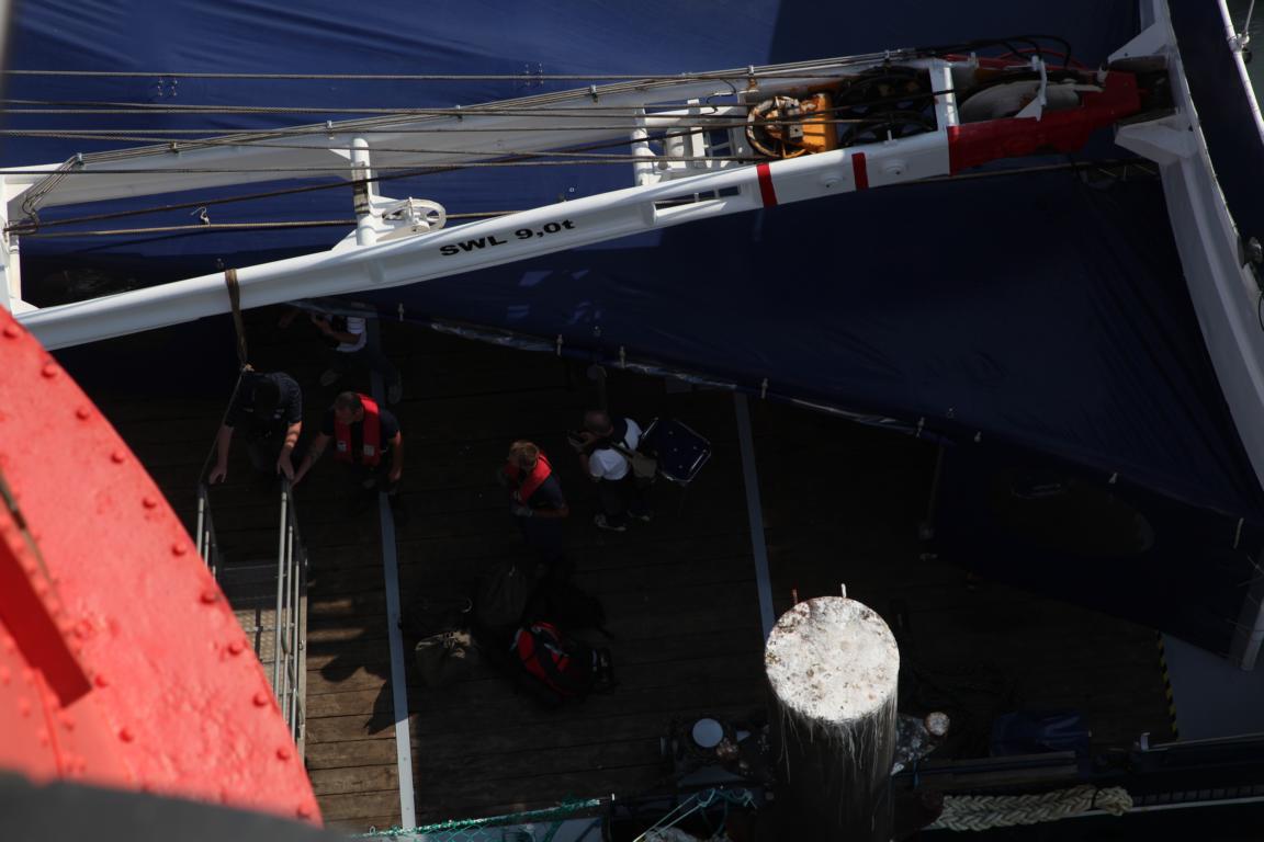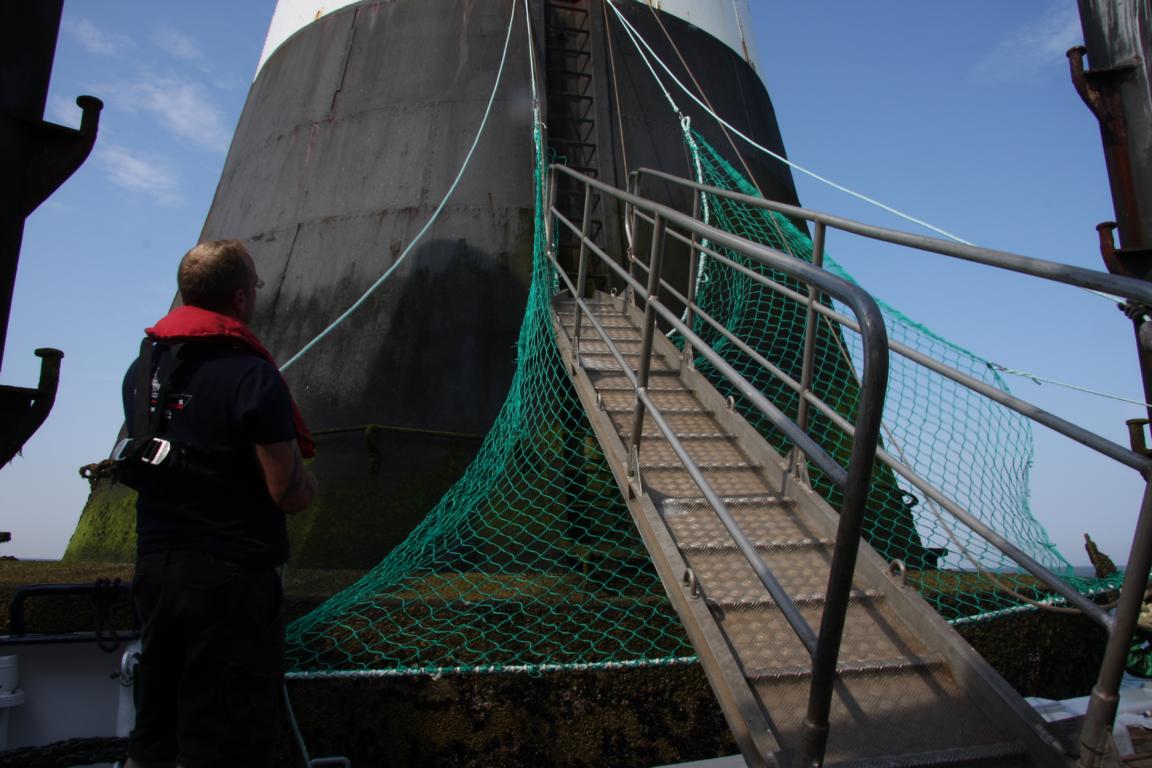 zunächst wird die Gangway ein ganzes Stück höher angebracht, dort, wo die Eisenstufen nicht mehr mit Algen bedeckt sind. Dadurch verkürzt sich das Stück, dass man hochklettern muss, deutlich. Dann wird unter die Gangway noch ein Netz gespannt -