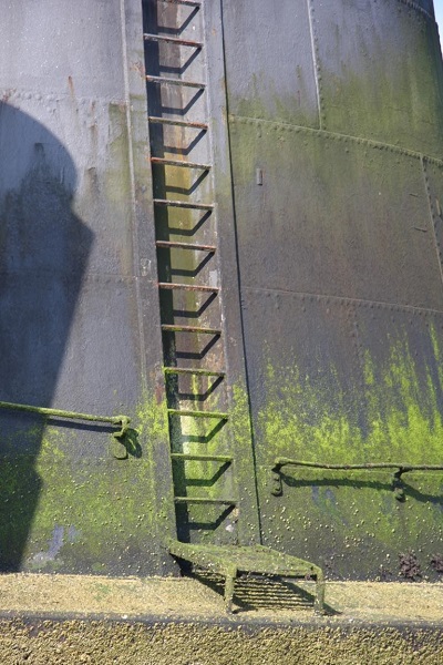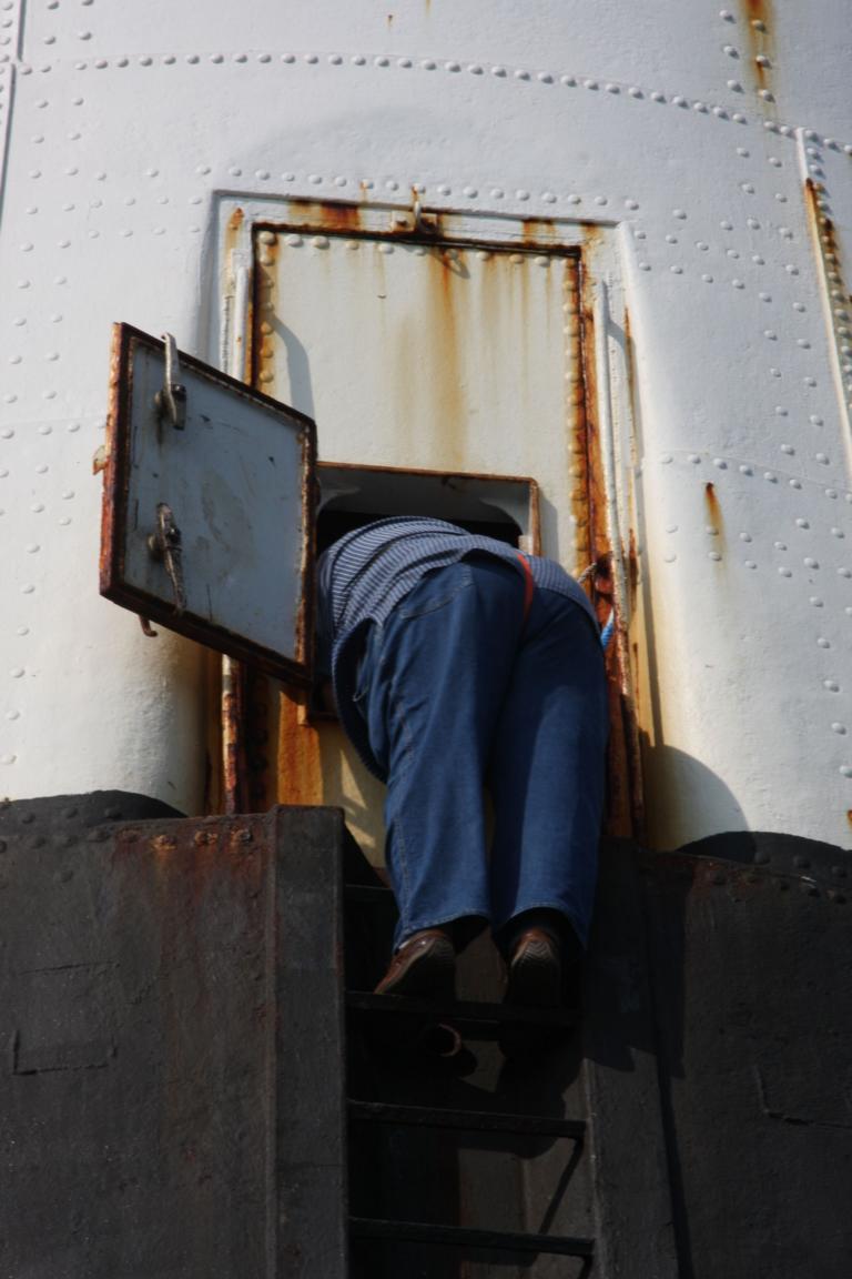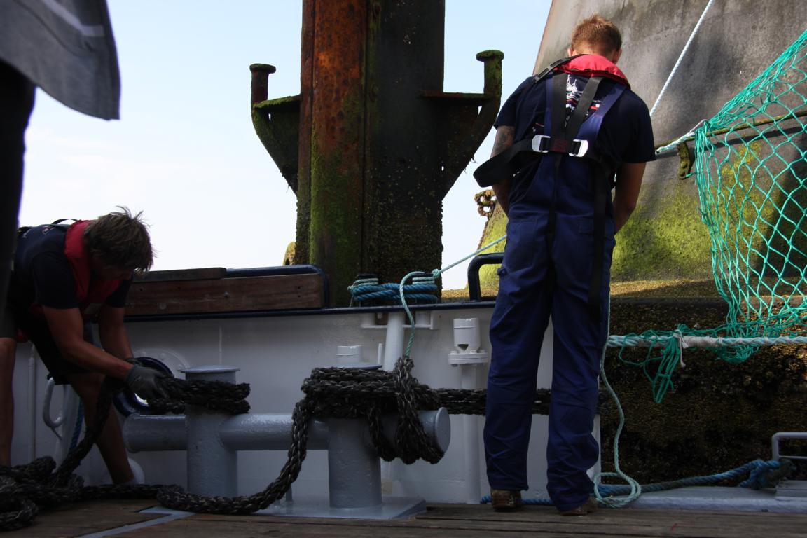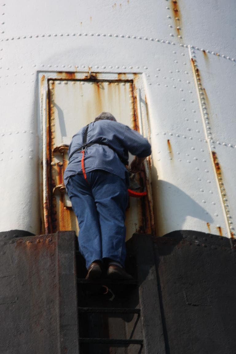 zunächst wird die Gangway ein ganzes Stück höher angebracht, dort, wo die Eisenstufen nicht mehr mit Algen bedeckt sind. Dadurch verkürzt sich das Stück, dass man hochklettern muss, deutlich. Dann wird unter die Gangway noch ein Netz gespannt -