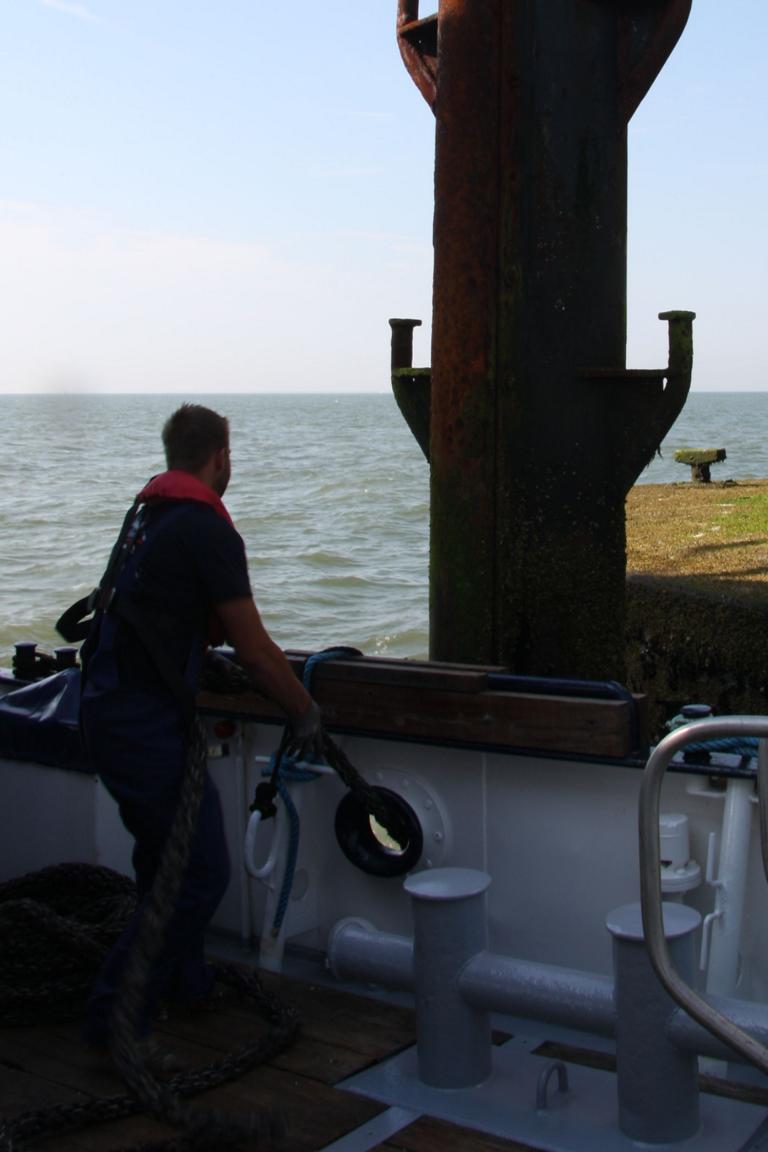 Dann wird es vertäut und die Gangway wird an die Metallleiter unten eingehakt.