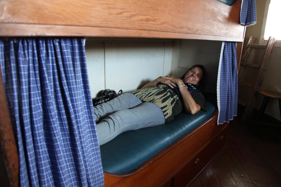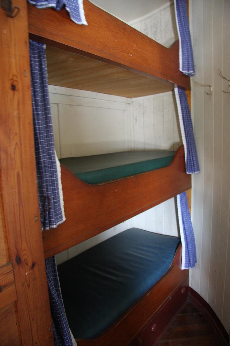 In der nächsten Etage stehen jeweils 3 Betten übereinander - die mittleren Betten sind gerade 1,80m lang - ich passe da wirklich von Wand zu Wand rein. Zum Schlafen wäre das sehr unangenehm. Jan und Okke hätten gar keine Chance- aber die anderen Betten rechts und links daneben sind etwas länger. Eng ist es aber auch in ihnen.