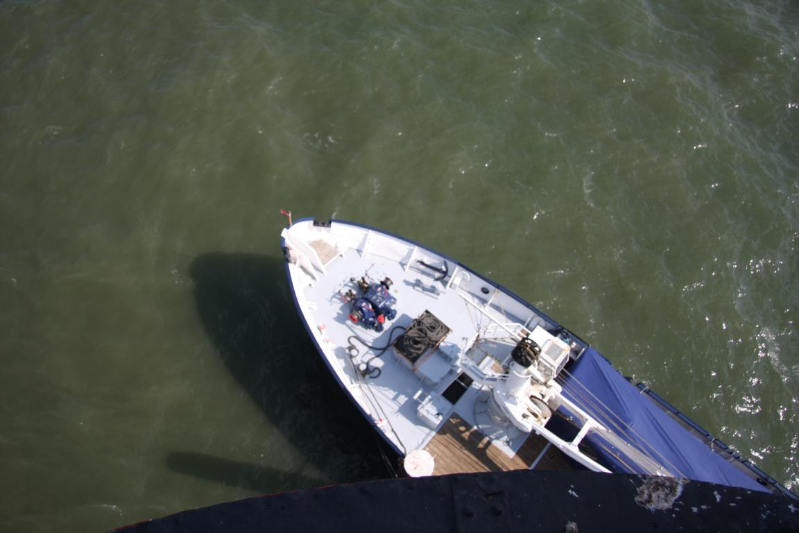 Nur langsam nähern wir uns dem Turm. Das Schiff kann übrigens wie ein Schlepper in alle Richtungen fahren.
