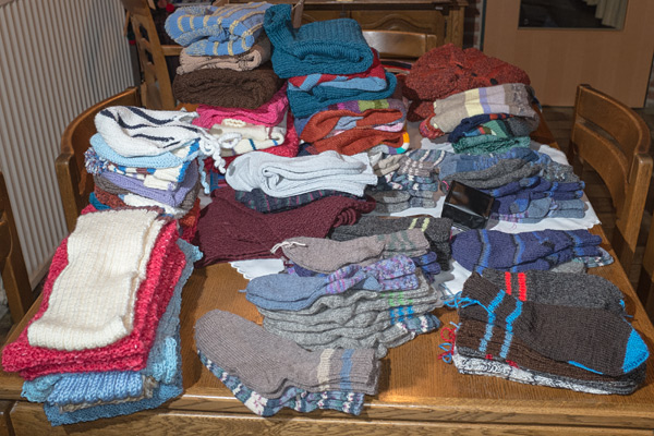 Vorgestern kam ein riesiges Paket an miot vielen gestrickten Sachen, die Damen aus einem Stift gestrickt haben, dann habe ich noch jede Menge anderer Sachen, wie hier einst geliebte Kuscheltiere, etliche Stollen, Sambal Olek, Medikamente, eine Strickjacke, ein Mantel und natürlich ganz viel Geld, welches ich dann vor Ort ausgeben werde.