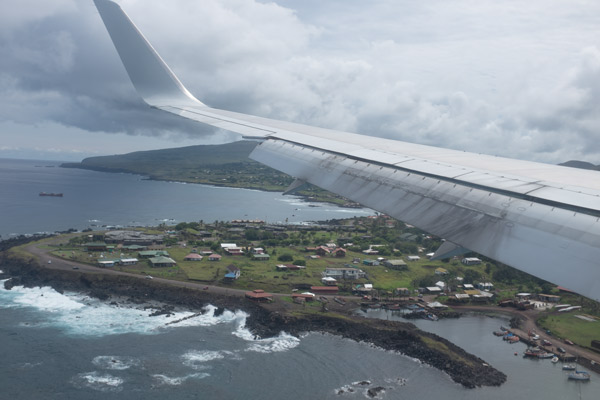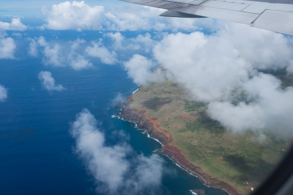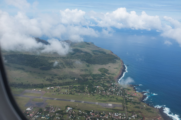 Sechs Stunden dauert der Flug zu den Osterinseln. Zu sehen gab es nicht viel vom meinem Fenster, denn es war immer Wasser unter uns. Die Menschen auf der Osterinsel leben am isoliertesten Ort der Welt. Die Entfernung von Santiago aus beträgt ca. 3.800 km und die nächste andere Insel ist Tahiti mit gut 4.000 Kilometern.