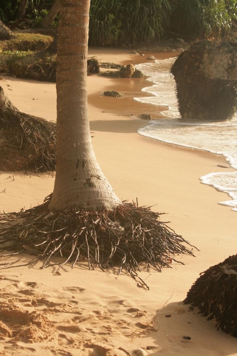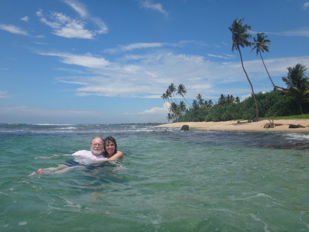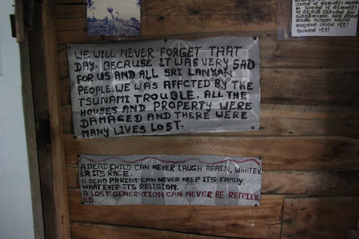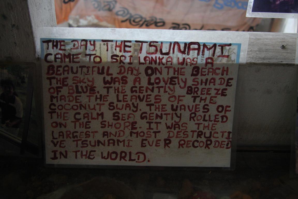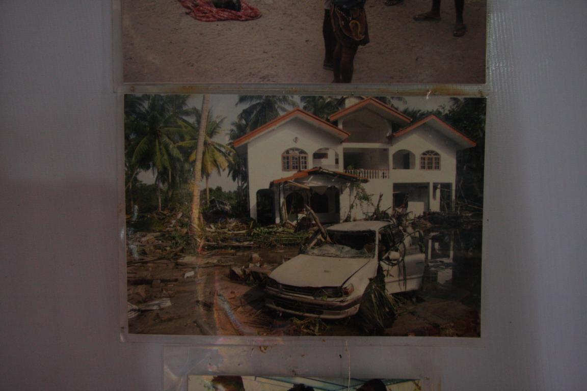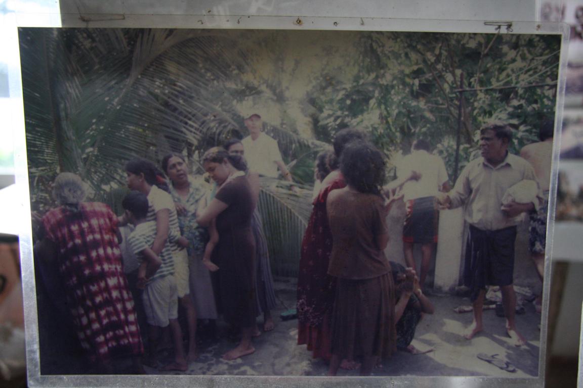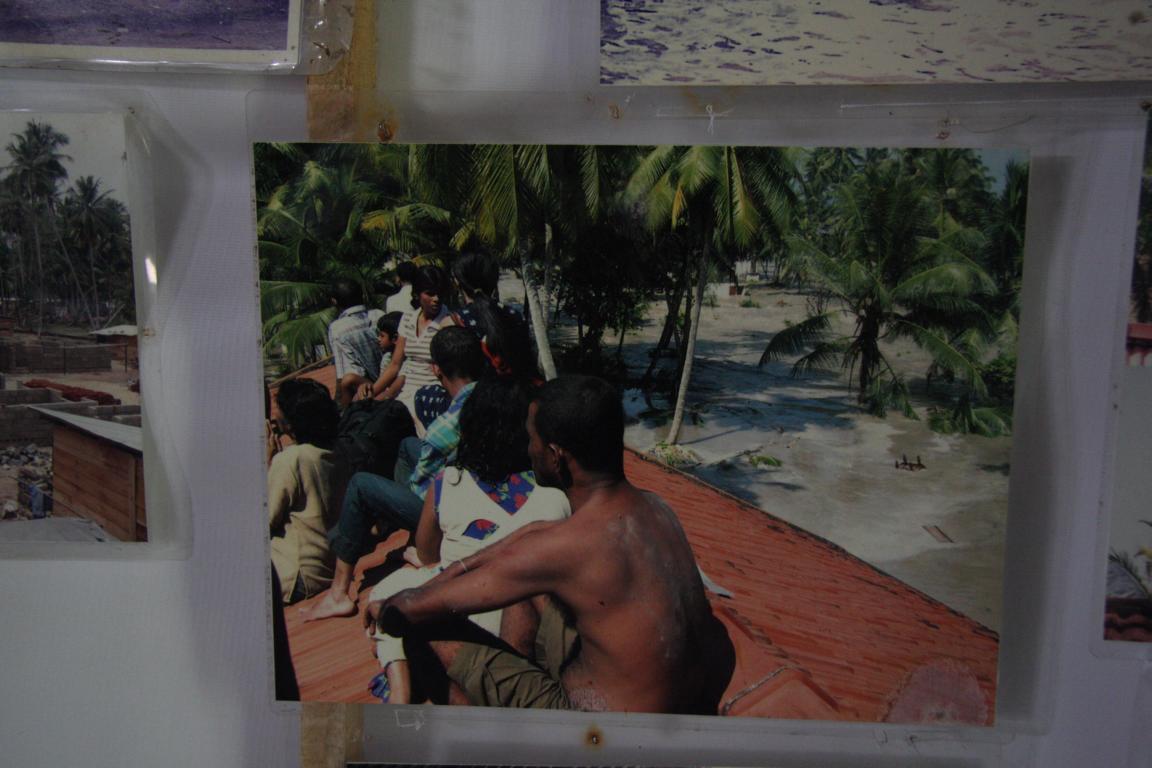 Unser Fahrer erzählte von seiner Familie - hier die Bilder: Auf Bild 1 sieht man in der Mitte seine Frau mit einem Kind auf dem Arm und links daneben eine ältere Frau - diese ist Sita, unsere Herbergsfrau. Erst hatten wir ja verstanden, das Frau und Kind umgekommen seien, aber es sieht nicht so aus, zum Glück. Sie konnten sich auf das Dach vom Haus Bild 2 retten, so wie diese Leute, Bild 3, die auch auf dem Dach sitzen. Das Haus steht auf der anderen Seite der Straße nach Galle, an der unsere Pension liegt. Auf Bild vier sieht man dann nocheinmal seine Frau, die das Kind stillt. Er selber hatte damals in Saudiarabien gearbeitet und ist dann zurückgekommen, um der Familie zu helfen. Seither ist er auch nicht mehr weg gewesen, sondern arbeitet nun als tourguide, wie sein Schwiegervater, der überlebt hat, weil er als Tourguide gerade unterwegs war. Von der Pension soll nur noch das Fundament über gewesen sein.
