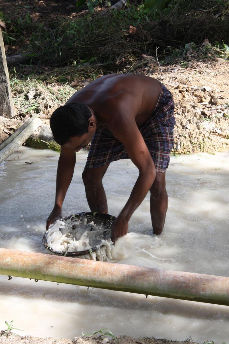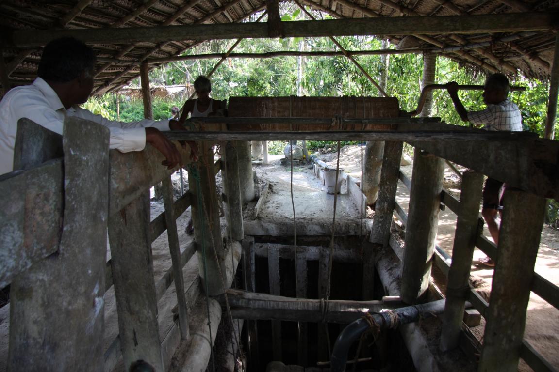 Es geht weiter zur letzten Station, einer MOndsteinmine. Mondsteine werden nur in dieser Gegend von Sri Lanka geborgen. In der Mine sind drei Mann unten den ganzen Tag, zwei stehen oben an einer WInde, und ziehen die Eimer mit den Gesteinsbrocken hoch