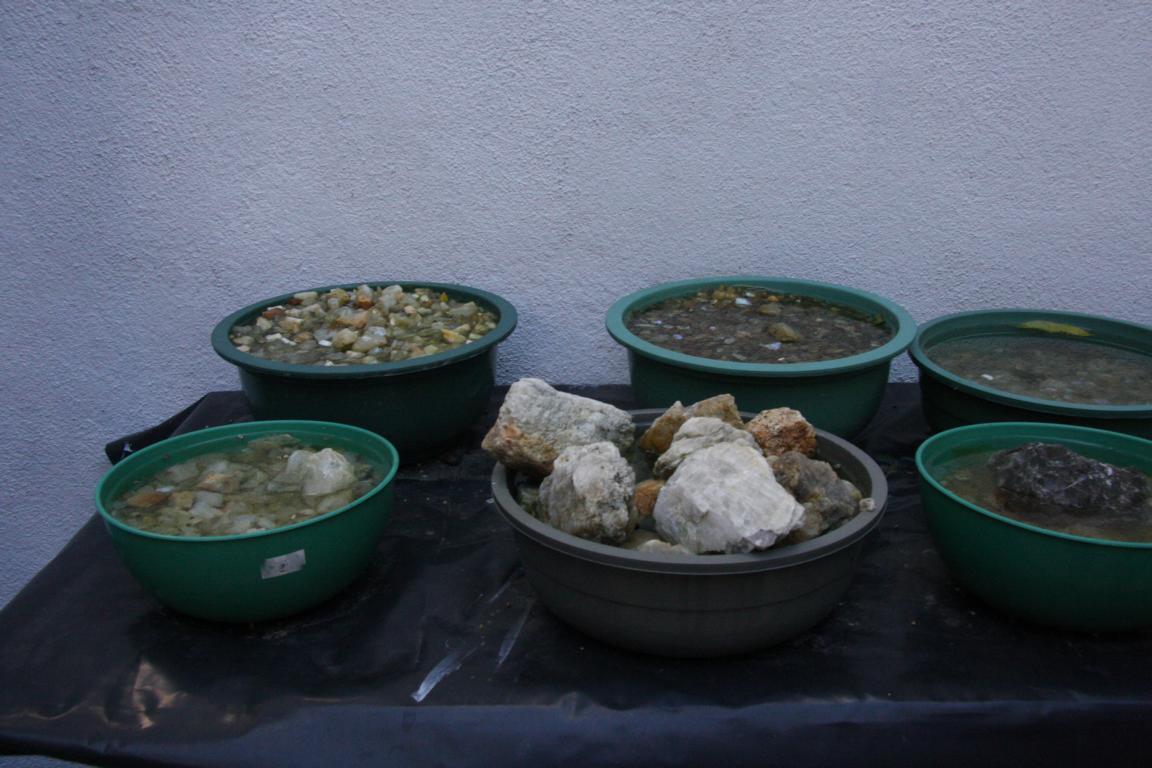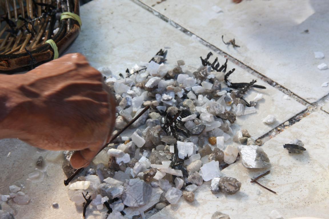 Dann werden die Brocken in ein geflochtenes Sieb umgefüllt und ausgespült - hier das Ergebnis - nun wird ausgesammelt, weißer Mondstein und blau schimmernder Mondstein. Die Gesteinsbrocken sehen eigentlich noch nach Nichts aus