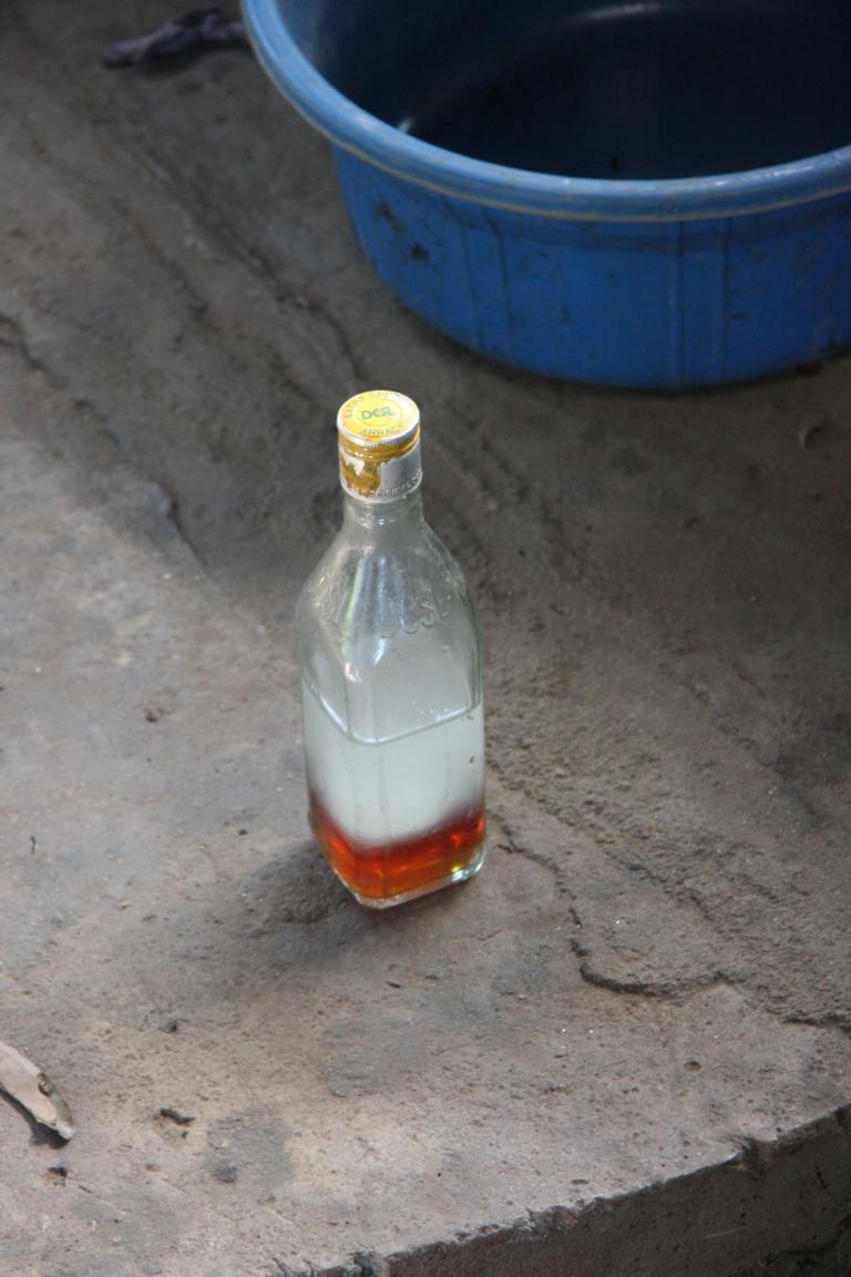 Kurz vor der Mine werden wir von einem wundervollen Duft umfangen, der an Zitrone erinnert, oder vielleicht auch etwas nach Nelkenöl. Im Bereich der Mine stehen Zimtbäume und es werden dort Blätter getrockner, dann zerstampft und weiter zu Öl verarbeitet. Das Zimtöl ist übrigens schwerer als Wasser, wie man auf dem Bild mit der Flasche sieht