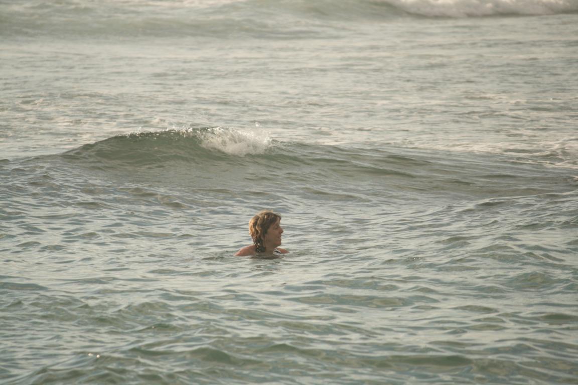 Zurück in der Pension gehen wir noch einmal baden - aber die Wellen sind heute hoch und es ist gefährlich. Wir halten uns dicht am Strand.