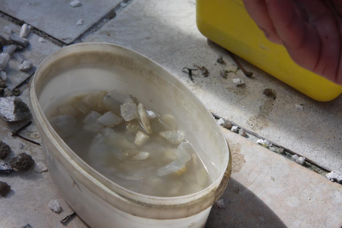 Dann werden die Brocken in ein geflochtenes Sieb umgefüllt und ausgespült - hier das Ergebnis - nun wird ausgesammelt, weißer Mondstein und blau schimmernder Mondstein. Die Gesteinsbrocken sehen eigentlich noch nach Nichts aus