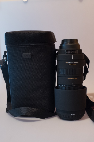 Ich habe es selten benutzt und es ist auch schon einmal von Sigma überprüft worden. Der Zustand von diesem Objektiv ist sehr gut. Keine Kratzer an den Gläsern und nur ganz geringe Gebrauchsspuren. Die Abblendkappe hat ein paar Kratzer, denn sie ist schon mal den Hang runtergerollt. Allerdings hat das absolut keine Auswirkungen auf das Ergebnis der geschossenen Fotos. Natürlich gehört der Köcher auch dazu.