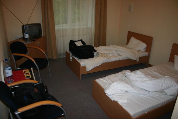 Im Hotel gibt es 23 Zimmer - als wir ankommen, ist keines belegt. Nach unserer Ankunft eines.... ein komisches Gefühl, so ein ganzes Hotel für sich zu haben. Zudem liegt unser Zimmer im 1. Stock in der hintersten Ecke. Es ist sauber, frisch renoviert, ausreichend groß, verfügt über 2 Einzelbetten, 2 bequeme Stühle, einen kleinen Tisch, eine kleine Kommode, eine Garderobe, einen Fernseher mit lettischen Programmen und ein Duschbad - was wollen wir mehr.