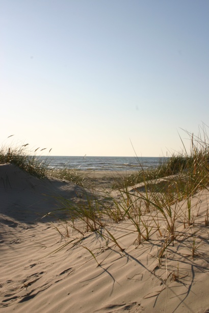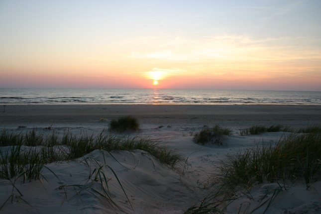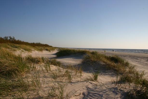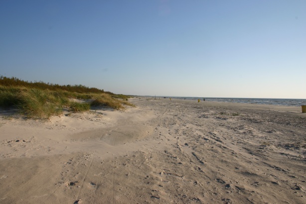 Wir schmeißen unser Gepäck rein und gehen dann gleich Richtung Strand. Das Hotel liegt direkt an der letzten Straße vor dem Strandpark, und damit - wie es im Prospekt heißt, " nur einen Windstoß vom Strand entfernt". Es ist wirklich nicht weit - ein Stück durch den Park und dann den Weg zwischen zwei Stadien durch, und schon sind wir da. Es erwartet uns ein unendlich langer, riesig breiter Strand, der teilweise befahren werden kann und eher an dänische Nordseeküste oder St. Peter Ording erinnert, einen staubfeinen Sand hat wie in Bornholm, leer ist. das Ganze bei Sonne und strahlend blauem Himmel - und dann natürlich herrlichem Sonnenuntergang, den wir dort erleben.