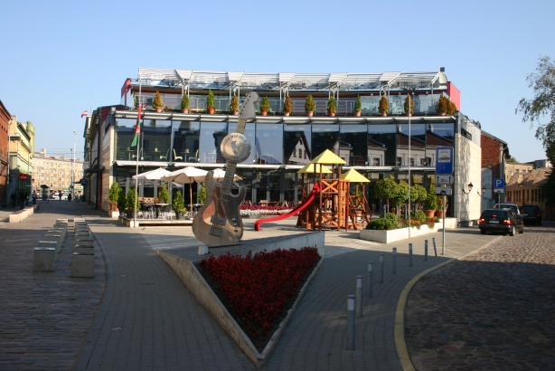Danach gehen wir auf gut Glück in die Richtung, in der wir das Zentrum vermuten, um ein Restaurant zu finden, denn in unmittelbarer Nähe des Hotels finden sich zwar 2 kleine Supermärkte, die bis 22.00 Uhr geöffnet sind und in denen wir auch etwas zu Trinken kaufen, aber keine Restaurants. Trotz Ortsunkenntnis finden wir wirklich nach ca. 10-15 Minuten Fußweg ein wunderbares Restaurant, in der wir auch mit Okkes Zöliakie etwas zu essen finden. (Es gibt auch vegetarisches). Okke ißt ein "Pork"gericht mit leckeren und zahlreichen Kartoffeln, mariniertem Gemüse und Pilzsoße(die ich wegen offensichtlicher Glutenhaltigkeit nehme) für 4,95 Lts, ich nehme Bratheringsfilet, ebenfalls mit leckeren festen leicht angegrillten Kartoffeln, Sourcream (die Okke nimmt), Gurken, roten Zwiebeln für 2,95 Lats. Beides macht uns supersatt. Danach geht es zurück ins Hotel.