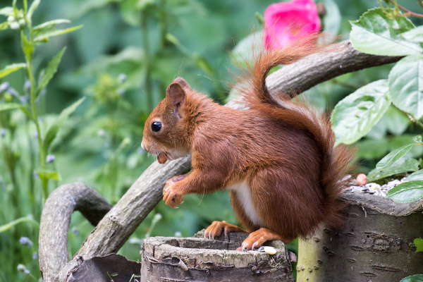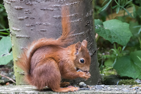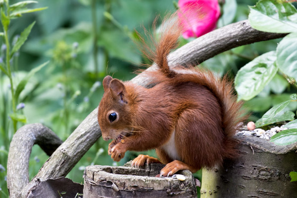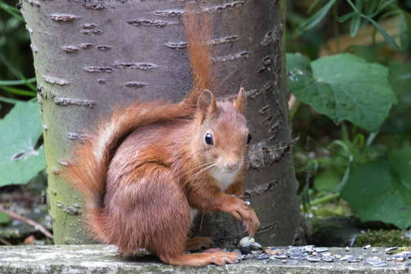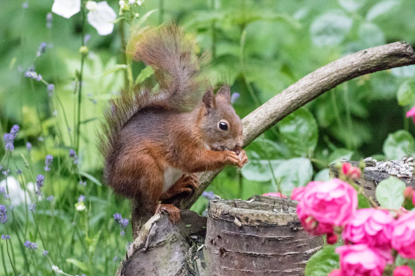 Gestern saß das Eichhörnchen wieder in meinem Garten und zwar auf dem Futterplatz für die Singvögel und hat genüsslich eine Walnuss verspeist. Es war so beschäftigt, dass es mich erst spät entdeckt hat und dann natürlich floh.