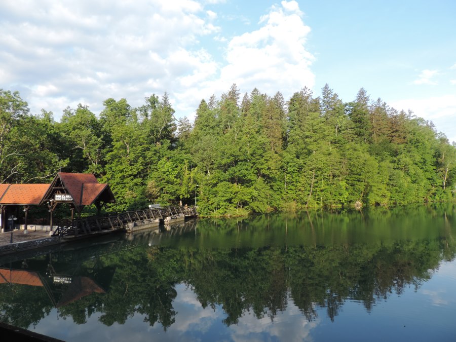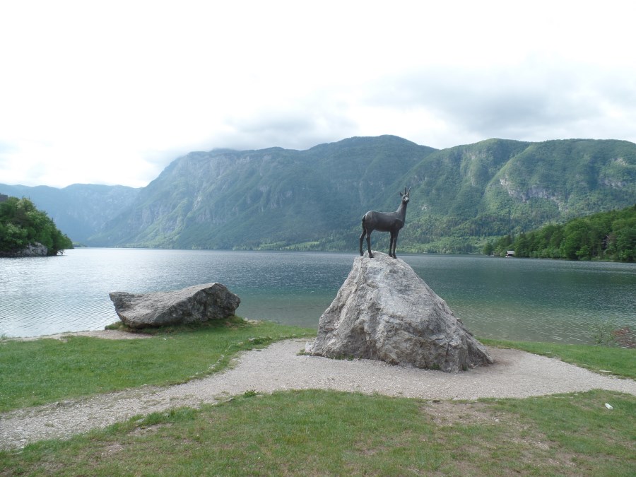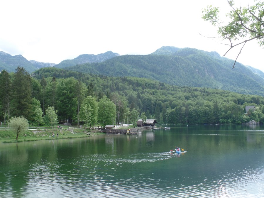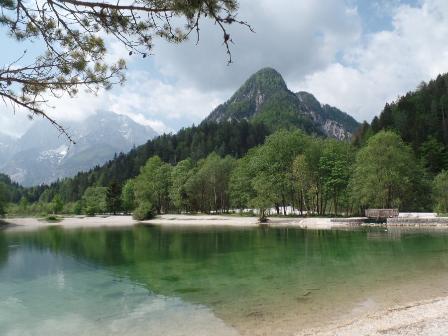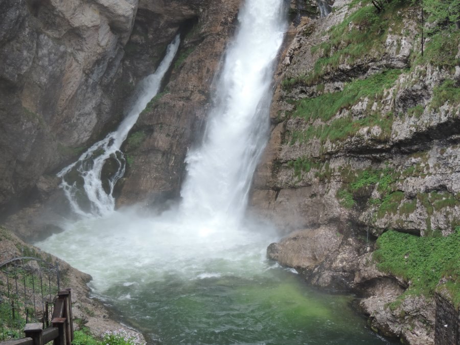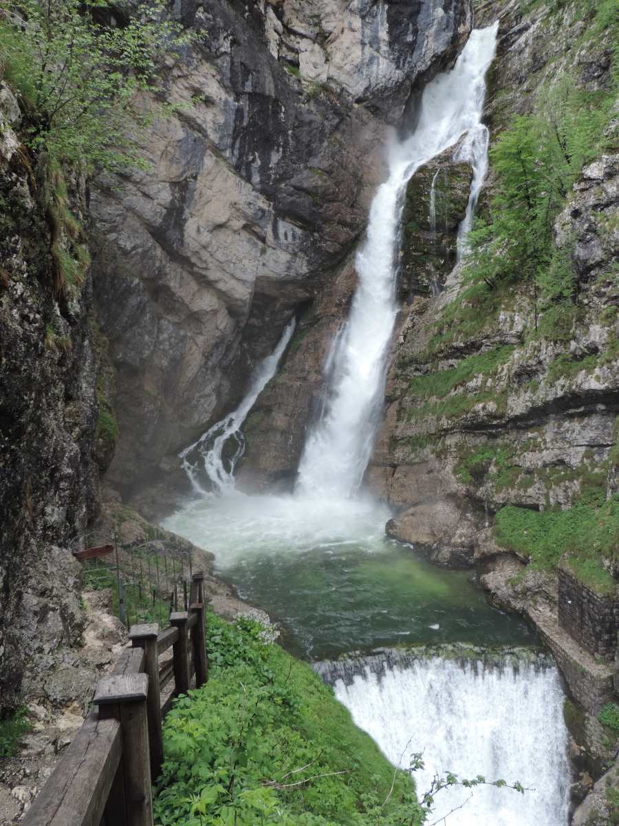 Dieser See liegt auch total im Grünen, heisst Bohinj und am Ende kann man einen Wasserfall erklettern.