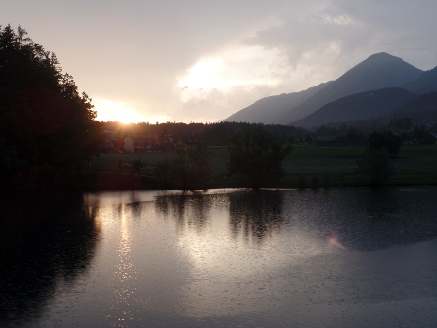 Jetzt ist gerade ein schöner Sonnenuntergang vor unserem Balkon und lustigerweise regnet es dabei. -
