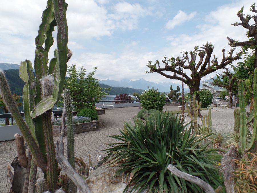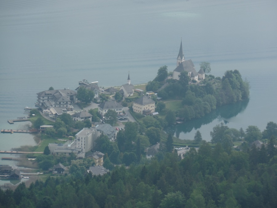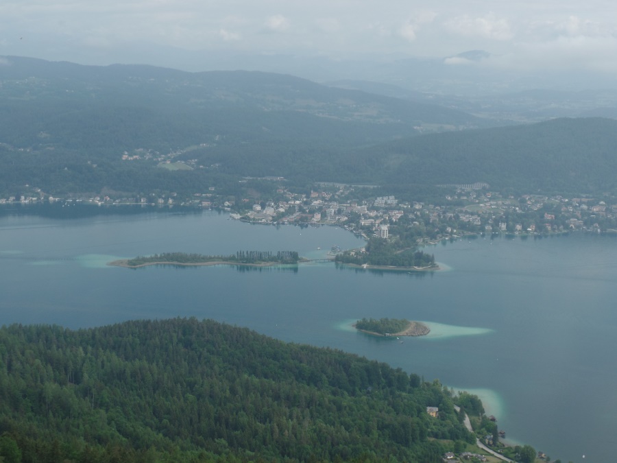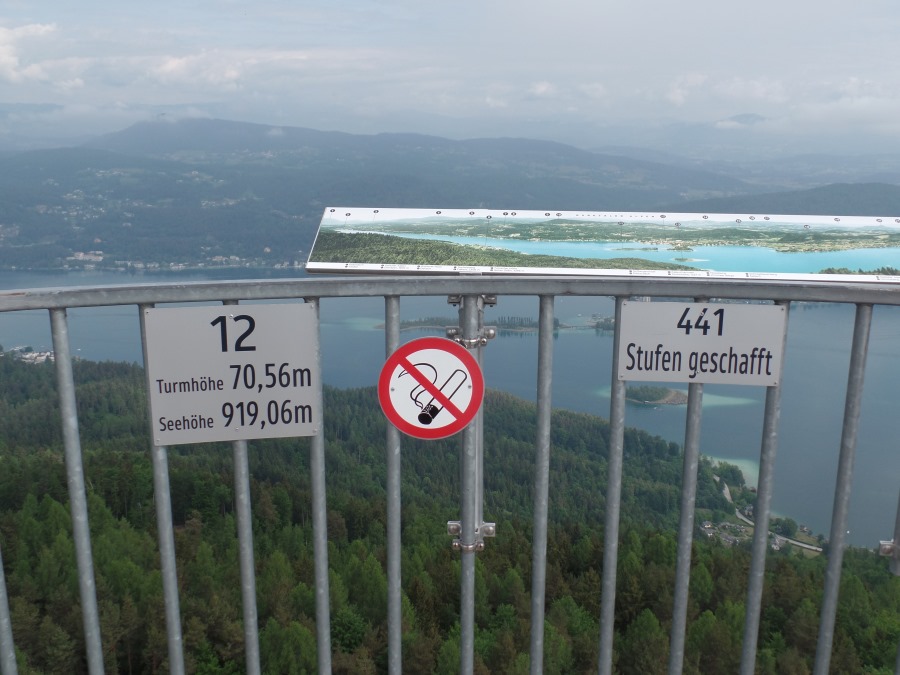 Hui, der Lift bringt uns sehr schnell nach oben - wir wollten diemal nicht Treppen steigen - und von dort hat man einen Überblick über den gesamten Wörthersee. Leider ist es ziemlich diesig aber so ist es eben. Schön ist es trotzdem. -