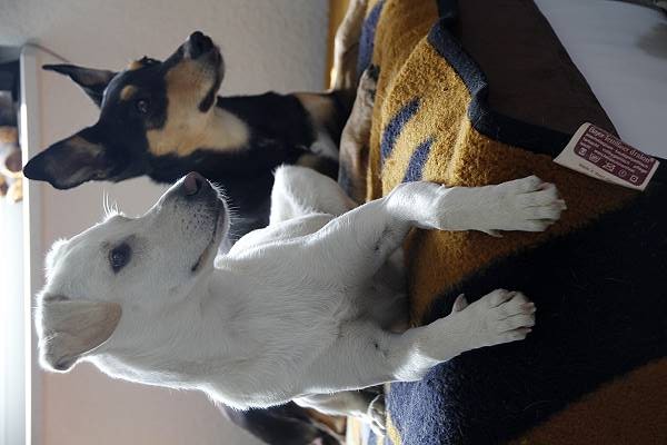 Valli ist zwar schon 1 1/2 Jahre alt - wirkt aber wie ein Welpe. Sie ist unglaublich verspielt. Benita ist es manchmal ein wenig zu viel, wenn Valli ihr zum 50. Mal ins Ohr knabbert und sie mit beiden Vorderpfoten umarmt. Aber Benita ist auch sehr gutmütig und lässt sich fast alles gefallen. Wenn es ihr zu viel ist, gibt's nur ein leises Knurren.