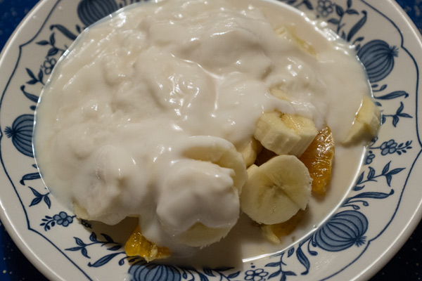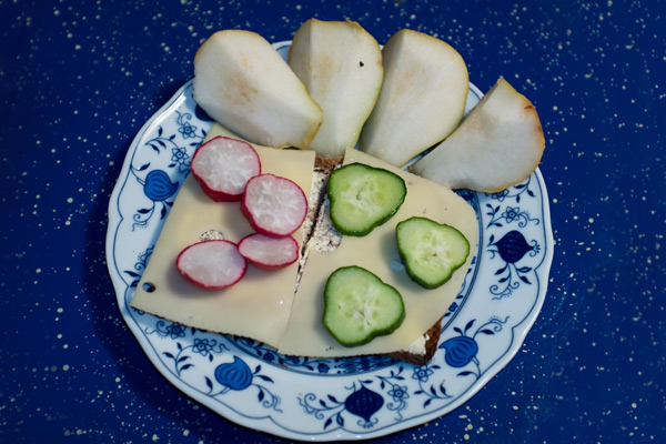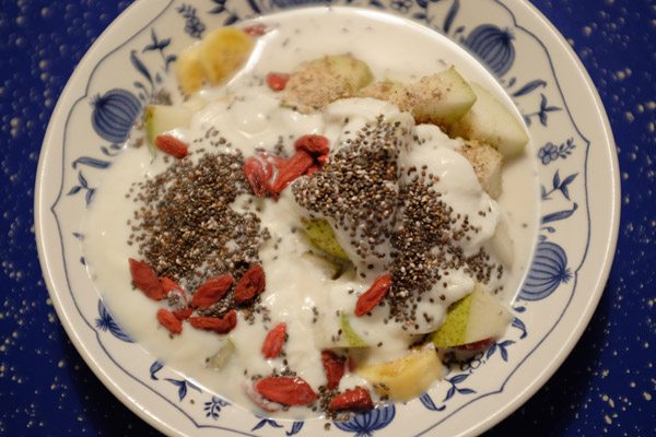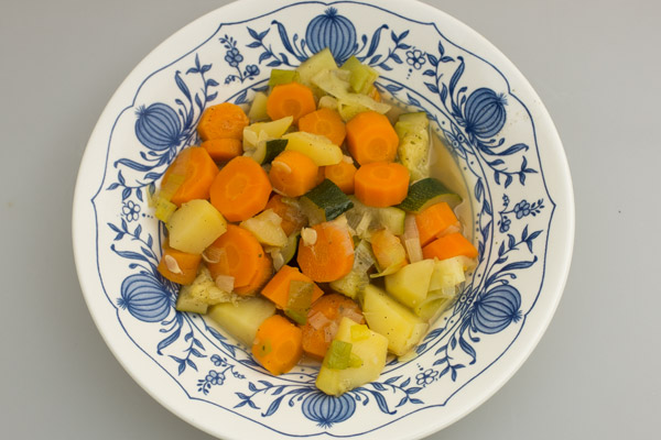 Zum Frühstück gab es Erdbeeren angetaut gemixt mit dem Saft von 2 Orangen. Dann durfte ich noch eine Suppe essen, mit Blumenkohl, Möhren, Weißkohl, Lauch, alles in Gemüsebrühe gekocht, püriert und mit Salz und Pfeffer gewürzt. Dazu etwas Petersilie.