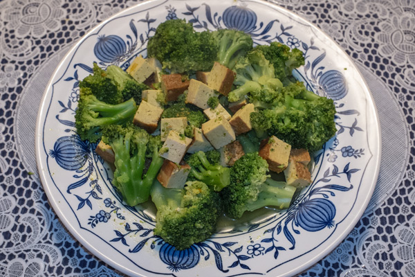 Dafür aber: viel Obst, sogar Bananen, Gemüse, Salate, Mandelmilch, Trockenfrüchte, Kartoffeln, Wasser, Kräutertee.