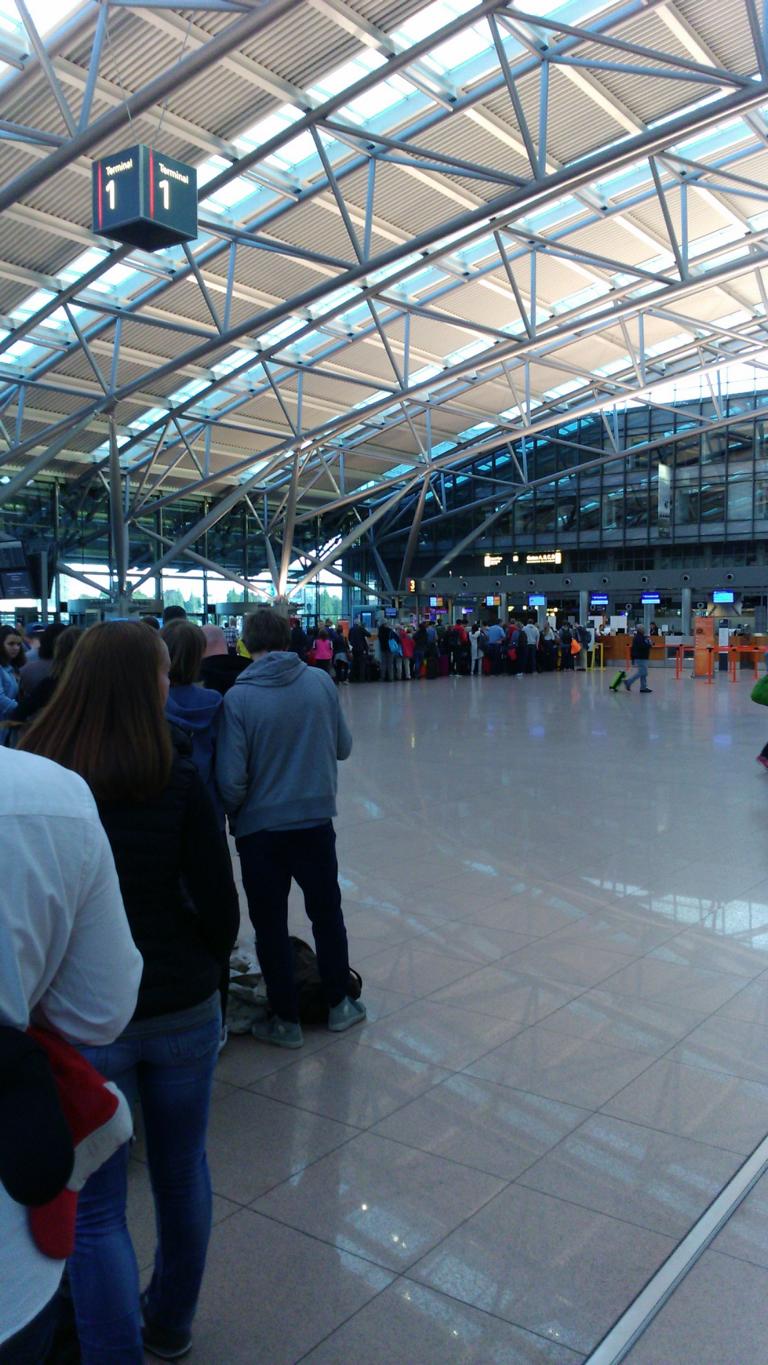 Es dauert, bis sich etwas tut, und dann geht es im Schneckentempo. Alle stehen in einer Warteschlange. Irgendwann kommt eine Mitarbeiterin und animiert die Leute sich in zwei Reihen anzustellen. Viel schneller geht es dadurch auch nicht, sieht aber nicht mehr so schlimm aus. Da Okke kein Gepäck aufgeben muss, geht er schon mal durch zum Einsteigen.