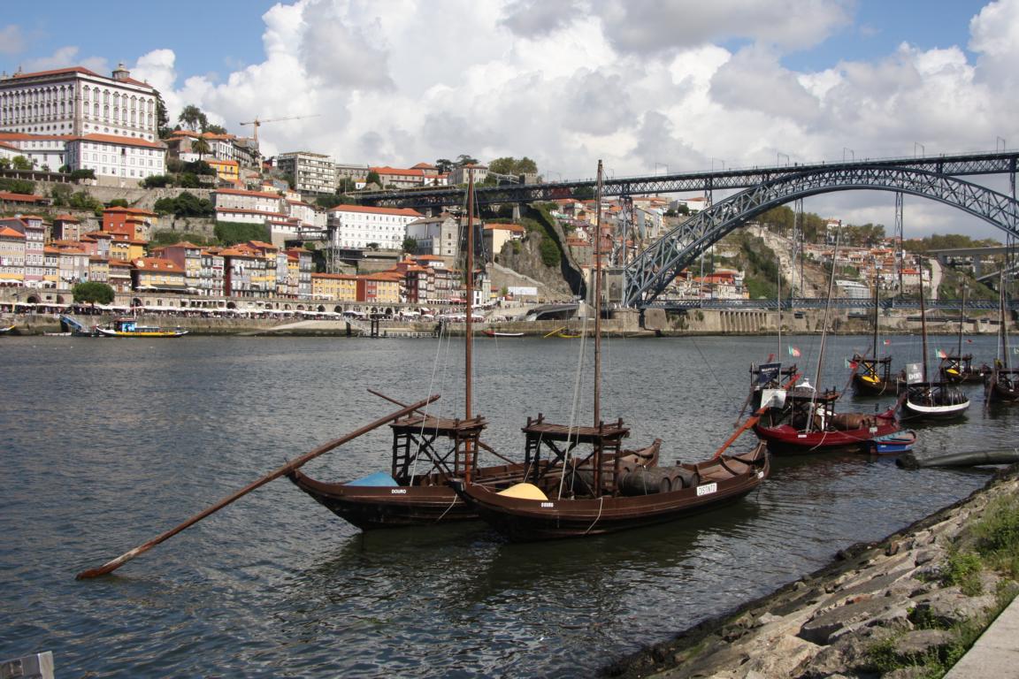 In Richtung Brücke liegen einige Boote mit großen Weinfässern