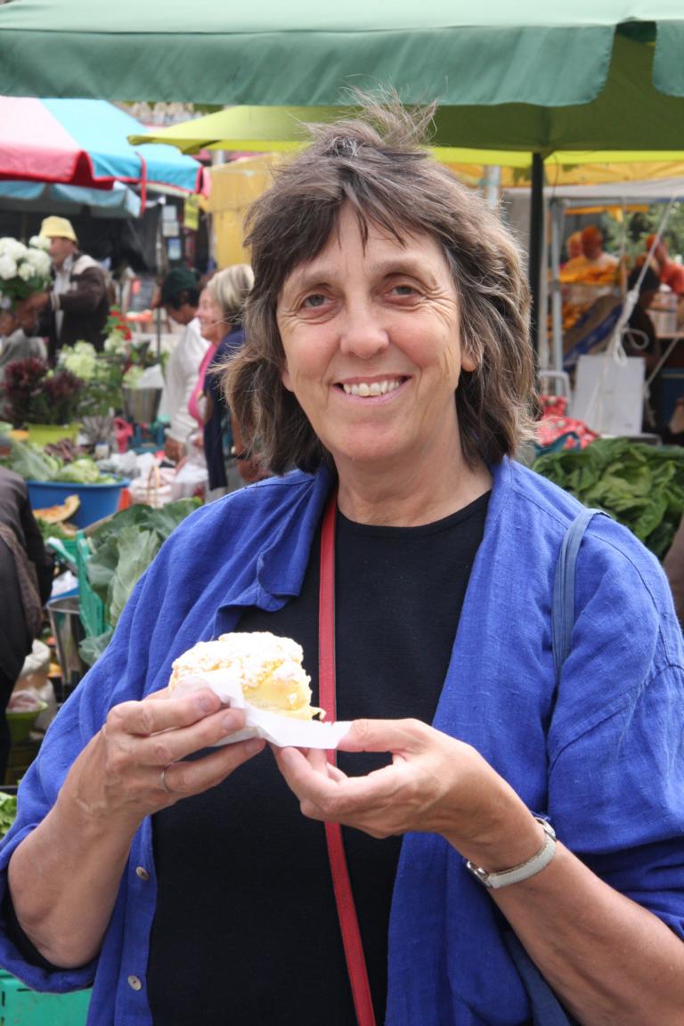 Die Backwaren sehen sooooo lecker aus - ich kann nicht widerstehen und kaufe ein großes Hefeküchenteil.... Beim Hereinbeißen bedarf es einen echten Mundaufreißer.... und es liegt kräftig im Magen, eben echter frischer Hefekuchen. Ich denke mir, dass ich die zweite Hälfte im Hotel essen... beim Versuch, das Teil irgendwie in meine Tasche zu packen, rutscht mir diese über die Schulter und fällt auf den Boden: MIST! Da war ein Glas Rosmarinhonig für meine Schwiegermutter drin - der es nicht überlebt hat - und eine Sardine aus Porzelan (bei der der Schwanz beim Sturz abgebrochen ist, von Jan zuhause wieder angeklebt wurde, der Honig wurde neu gekauft) - ein Schweinkram sonder gleichen