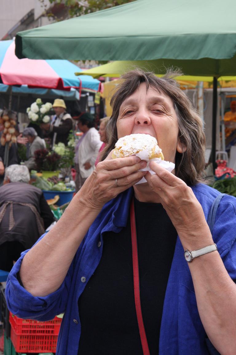 Die Backwaren sehen sooooo lecker aus - ich kann nicht widerstehen und kaufe ein großes Hefeküchenteil.... Beim Hereinbeißen bedarf es einen echten Mundaufreißer.... und es liegt kräftig im Magen, eben echter frischer Hefekuchen. Ich denke mir, dass ich die zweite Hälfte im Hotel essen... beim Versuch, das Teil irgendwie in meine Tasche zu packen, rutscht mir diese über die Schulter und fällt auf den Boden: MIST! Da war ein Glas Rosmarinhonig für meine Schwiegermutter drin - der es nicht überlebt hat - und eine Sardine aus Porzelan (bei der der Schwanz beim Sturz abgebrochen ist, von Jan zuhause wieder angeklebt wurde, der Honig wurde neu gekauft) - ein Schweinkram sonder gleichen