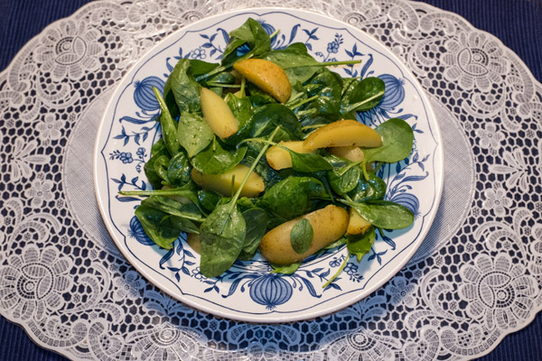 Bei uns gab es heute einen warmen Kartoffelslat mit Spinat. Das ging schnell, ist fettarm und hat sogar geschmeckt