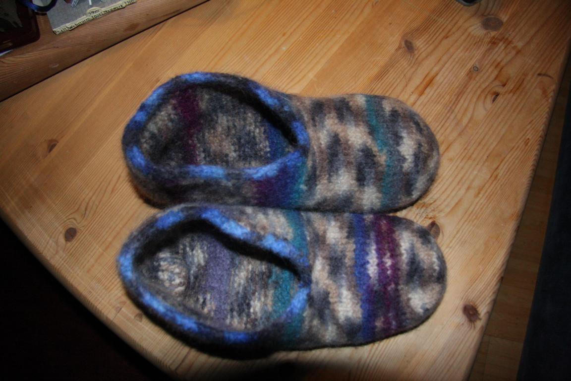 Einem Freund habe ich zum Geburtstag ein Paar Hausschuhe versprochen/geschenkt - gerade kommen sie aus der Waschmaschine - sie sollten Gr. 46 sein, ich habe sie nach der Anleitung von der ALDI Wolle iin Gr. 44/45 gestrickt. Vor dem Waschen waren sie riiiiiiiiesig!