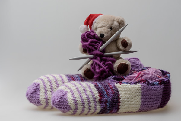 Nun folgt die Spitze auch in lila. Jeweils die ersten beiden Maschen auf jeder Nadel werden zusammengestrickt bis nur noch 2 Maschen auf jeder Nadel sind. Diese habe ich zusammengezogen und den Faden von innen vernäht. Nun wird die Ferse hinten zusammengenäht und alle weiteren Fäden vernäht.