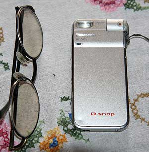Es ist eine Panasonic D-Snap SV AS 10, (Video-Kamera, Diktiergerät, MP3-Player und schwenkbarem Objektiv)) Sie wurde bis 2006 hergestellt, hat eine Auflösung von 1600 - 1200, wiegt nur 57 g und ist 10 mm hoch. Also genau richtig für die Hosentasche ;D