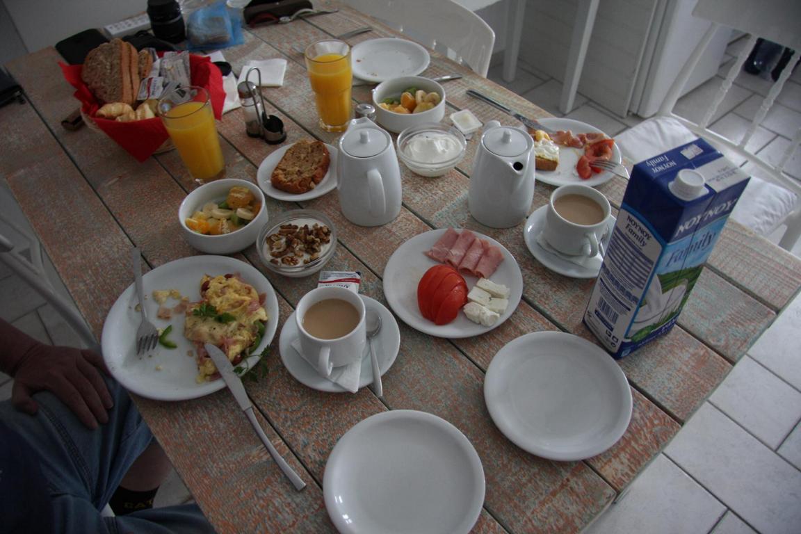 12,8 Grad sind morgens – für ein Frühstück draußen zu kalt.Ich habe mir heute, wie Jan gestern schon, ein Omlett mit allerlei Dingen bestellt und es is so gehaltvoll, dass wir beide den ebenfalls bestellten griechischen Quark und die Früchte nicht schaffen. Wir stellen beides zusammen in den Kühlschrank für später.