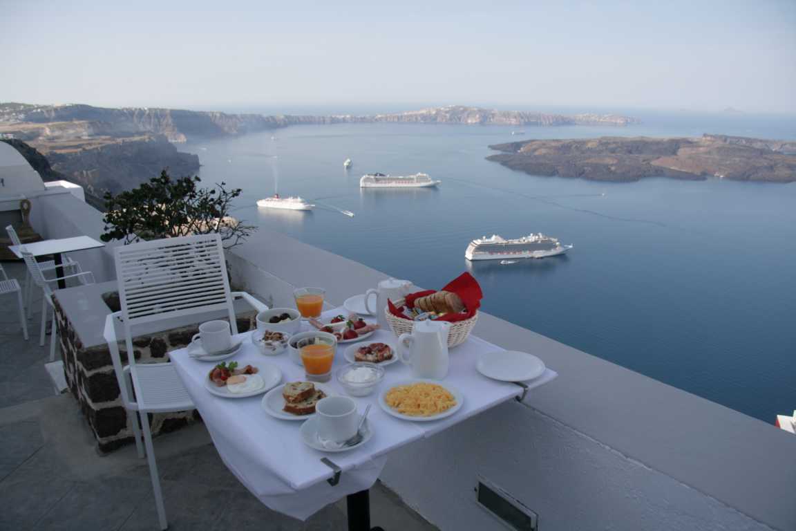 Heute genießen wir ein letztes Mal ein tolles Frühstück mit Blick auf vier Kreuzfahrer! Später kommt sogar ein fünter hinzu... es wird Zeit hier wegzureisen