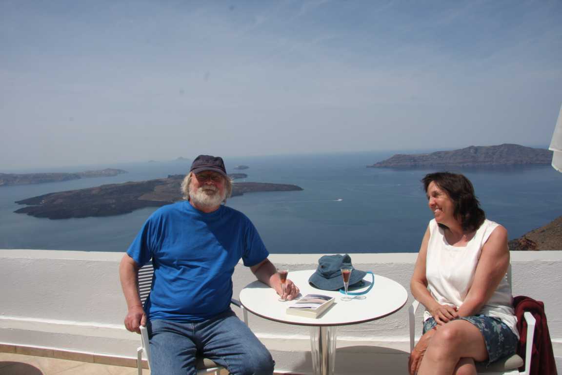 Bis 12 können wir in unserer Unterkunft bleiben, die letzte Stunden sitzen wir auf der Terrasse über uns bei Alexandra,bei der Rezeptiron, die noch ein Foto von uns macht und uns mit einem Vinsanto und Jan mit einem Bier versorgt - sehr sehr nett!