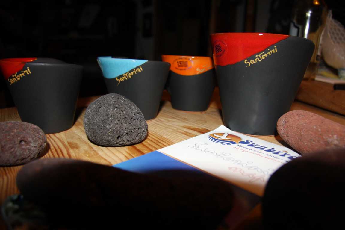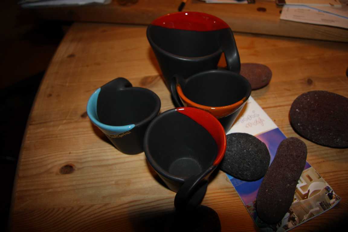 Hier noch zwei Bilder von unseren Bechern, drei kleinen für Expresso, ein größerer für Kaffee und Steine vom Red Beach....