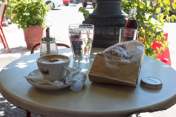 , dafür wehte aber ein Wind, der uns beinahe aus dem Sattel hob.Bis Thiva waren es rund 100 Kilometer, die wir in anderthalb Stunden gefahren sind. Eine Pause war überfällig.