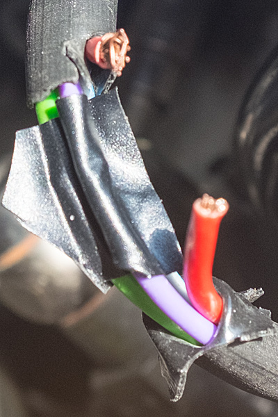 Auch beim grünen und violetten Kabel sah man Beschädigungen an der Ummantelung. Es war nicht so einfach, die Ummantelung aufzuschneiden etc.Manchmal musste ich nach Anweisungen arbeiten, weil meine zarten Finger besser hineingreifen konnten.