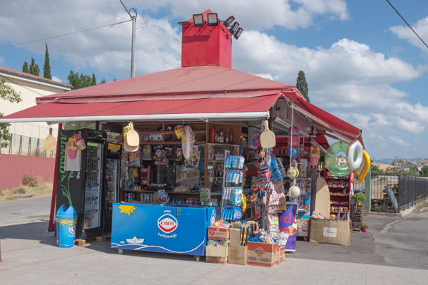 Wir fanden nur diesen Kiosk, der offen war. Es gab die berühmten Schokocroissants, eine Cola und Wasser. Man wird genügsam und erfreut sich auch an Kleinigkeiten. Kaffee gab es natürlich nicht. Glücklicherweise stand auch ein Tisch mit Stühlen vor dem Kiosk.