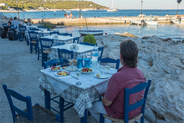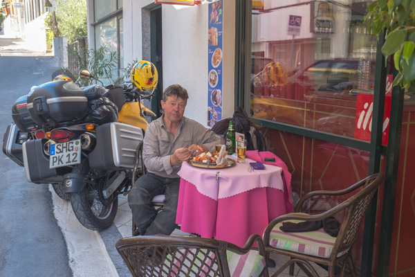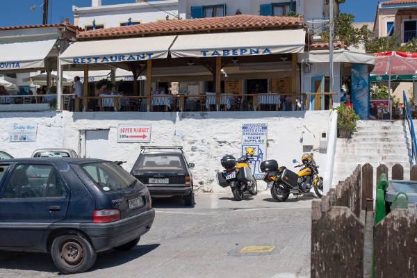 Als erstes hielten wir beim Cafe Marina an. Es gab eine herzliche Begrüßung. Wir hatten uns nämlich nicht angemeldet und hatten auch noch keine Unterkunft. Zu unserem Schrecken erfuhren wir, dass hier so gut wie alles ausgebucht ist, denn die Athener verbringen gerne die verlängerten Wochenenden hier.
