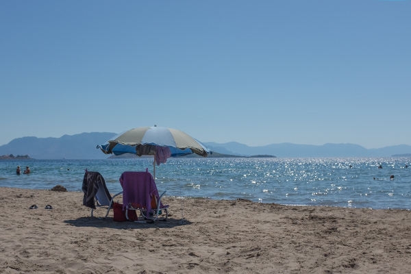 Am Strand von Marathonas legten wir einen Badestop ein. Zwei Liegen und ein Sonnenschirm kosten 6 Euro. Ich habe ja meinen Campingstuhl mit, der ist schnell aufgebaut und ich sitze lieber im Stuhl als auf der Liege.