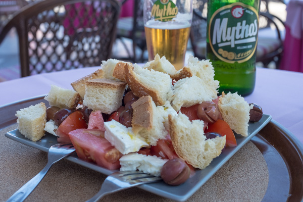 Nachdem wir wieder in Agia Marina angekommen sind, machten wir wie immer erst einen Stop bei Panos und tranken ein eiskaltes Mythos. Der Teller voll mit Tomaten, Käse, Oliven und Brot bekommen wir immer gratis dazu.