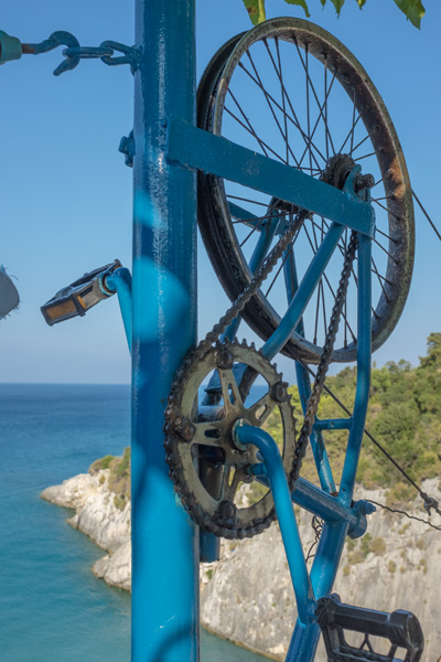 Das Wasser wird zwar nicht rauf transportiert, sondern runter zum Strand zum Trinken. Ich könnte mir vorstellen, das es sich um einen selbst erbauten Lastenaufzug handelt um Lebensmittel von der Strasse oben an den Strand runter zu transportieren.