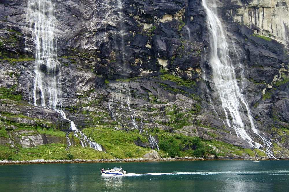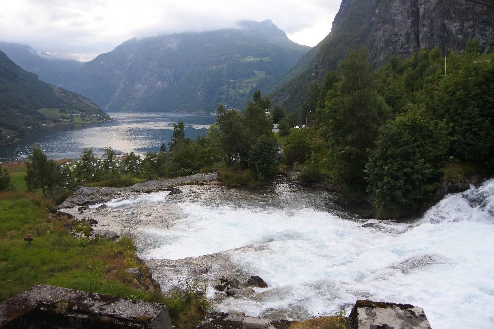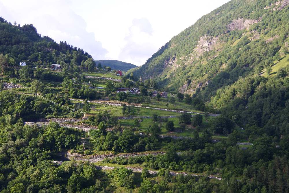 Dann aber sahen wir die Wasserfälle mit den Namen wie Brautschleier, die 7 Schwestern oder der Freier und fuhren am Fjord entlang bis zum Ort Geiranger, wo wir im Geiranger Hotel eine Nacht verbrachten. -