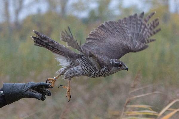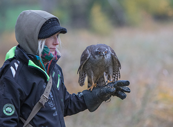 Hier seht Ihr Hella den Habicht mit der Falknerin Lisa Schubach.