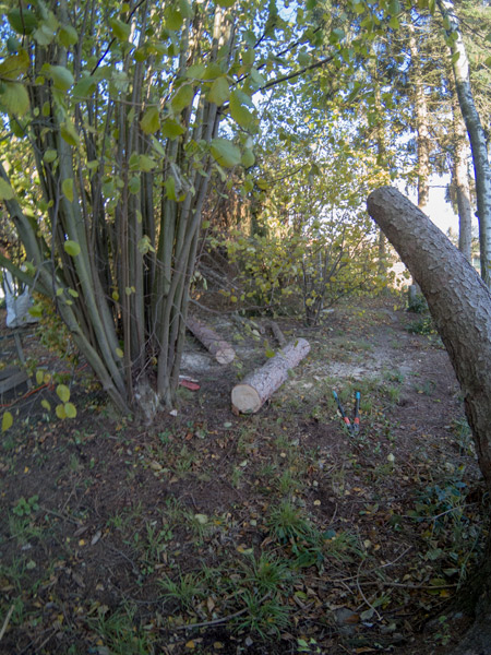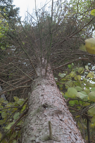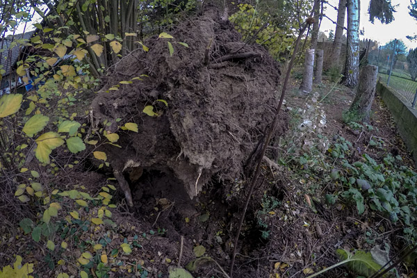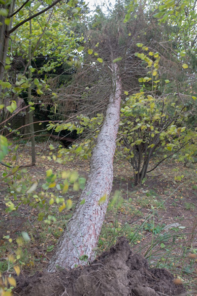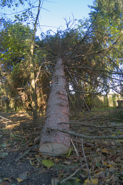 Etwas später schaute ich noch einmal in den Garten und bekam einen riesigen Schrecken, eine der alten Fichten war umgestürzt.